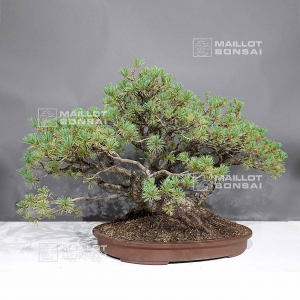 Hauteur : 480 mm *1150 mm. Poterie non émaillée brune de qualité de :600*380*70 mm. Aiguilles courtes et légèrement bleutées. Style rare « korabuki » en dos de tortue composé de 5-6 troncs. Bonsaï âgé de plus de 50 ans avec son écorce formée, issu de prélèvement yamadori il y a plus de 30 ans, bien ramifié avec bonne conicité des troncs. Pas de traces de greffage car c'est un semis naturel, ni de fortes blessures de fils seulement une plaie de taille mastiquée visible sur les photos. Troncs de Ø +-40-50 mm au nebari énorme de 280-300 mm. Sujet de qualité pour amateur qui prendra le temps de le tailler et éventuellement de poser des ligatures. Rempoté en février 2019. Il est à noter dans le cycle végétatif du pin a 5 aiguilles qu'a partir du +- 20 aout les aiguilles d'il y a deux ans vont commencer à jaunir et tomber de par ce fait actuellement elles commencent à jaunir un peu.