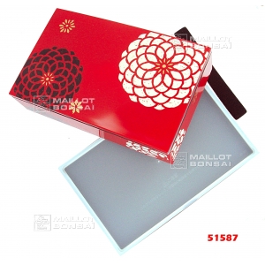 Boite bento japonaise contenance totale 900 ml. Dimensions: 170*105*79 mm. En ABS coloris rouge motifs fleurs de chrysantheme. Peut être passé au lave vaisselle et au four micro ondes. 2 compartiments de 450 ml. avec son couvercle intérieur et 1 compartiment de 450 ml. Avec couvercle intérieur aussi. Elastique de maintien fourni.