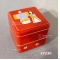Bento a deux niveaux de: 64*64*64 mm. Coloris rouge sombre. 1 Niveau de 80. ml et un niveau de 80 ml avec son couvercle. Couvercle décoré d’un couple en kimonos. Au japon utilisé pour la présentation des pâtisseries qui accompagnent lm=a cérémonie du thé. Aussi lors des repas pour mettre en valeur des petits ingrédients tels : œufs de cailles, légumes, épices etc.